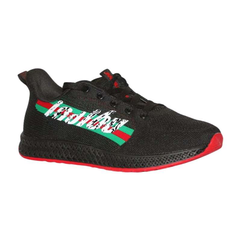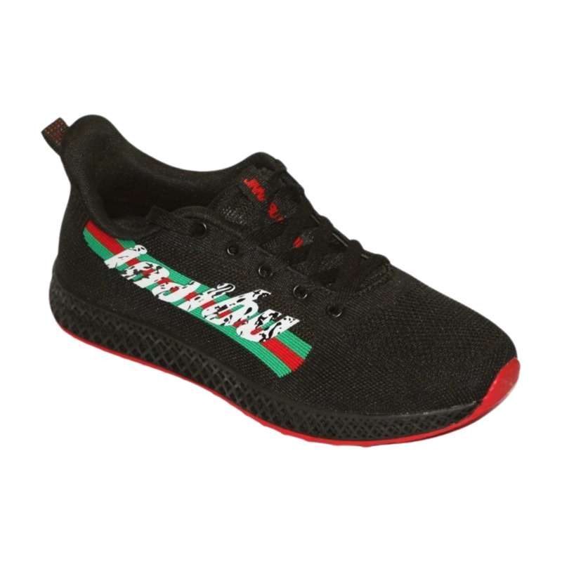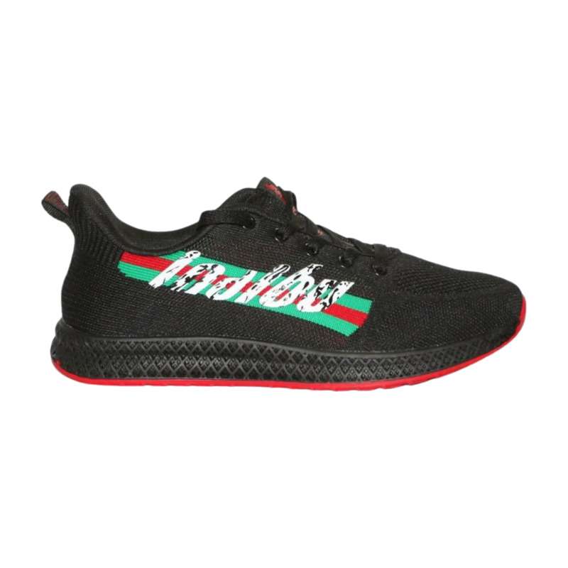 Introducing the imported Jinnaibu sneakers, featuring a sleek mostly black design with striking red accents. These sneakers are perfect for casual outings, sports, and jogging. Their versatile look makes them an ideal choice for both men and women.